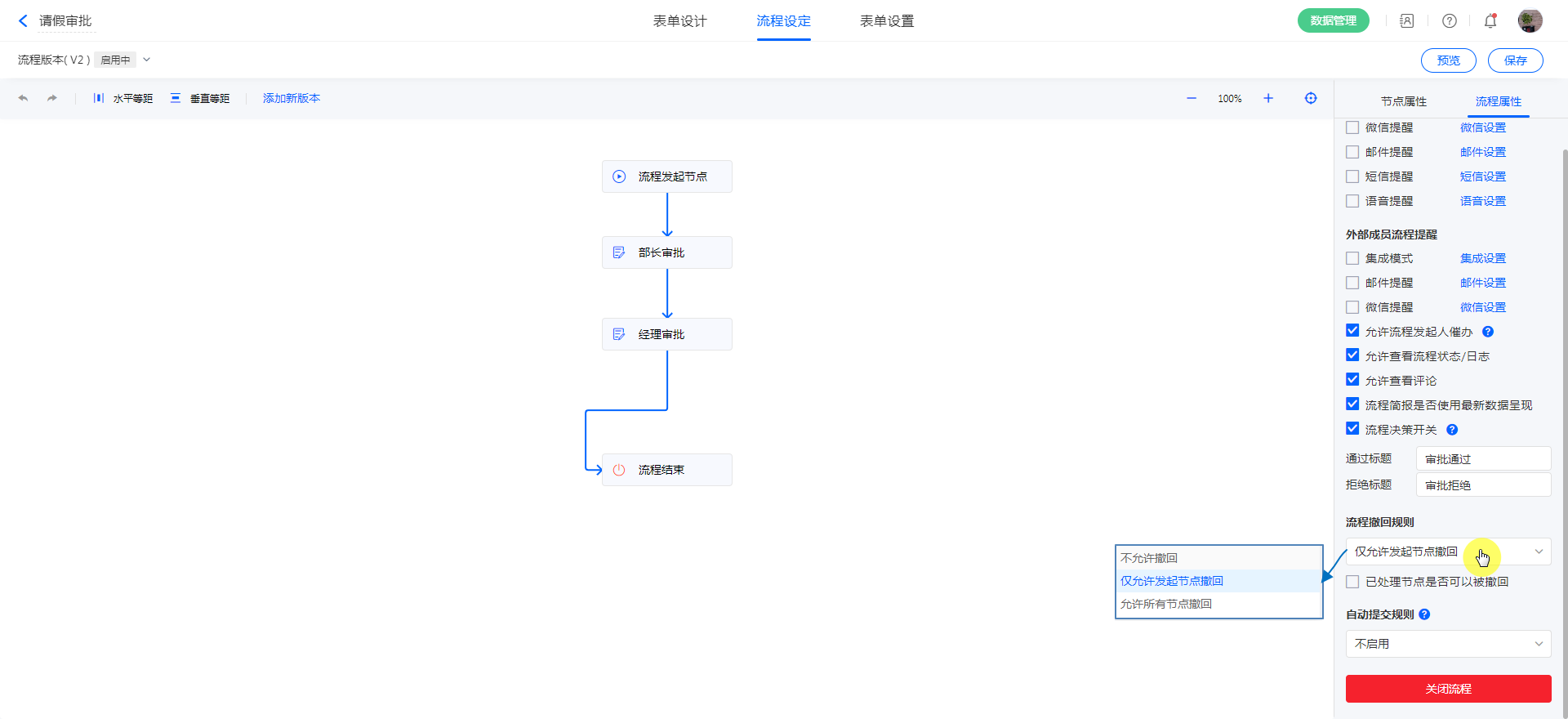 当流程撤回设置为[仅允许发起节点撤回]/[允许所有节点撤回],才会显示[已处理节点是否可以被撤回]属性。