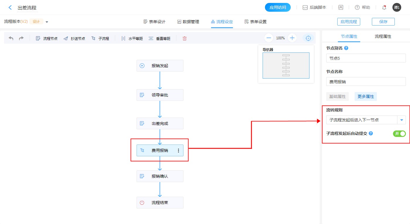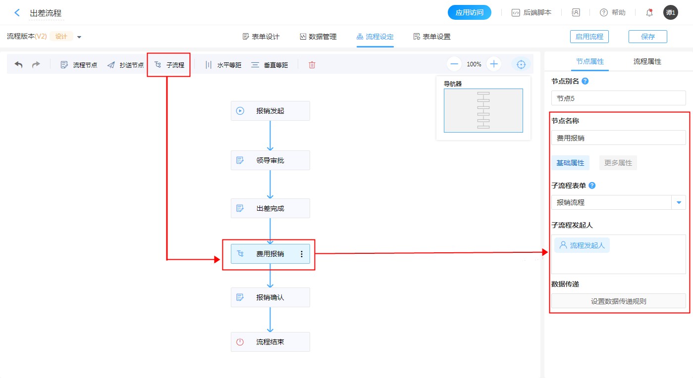 下面通过出差(父流程)与报销流程(子流程)的协作来讲解子流程的配置。