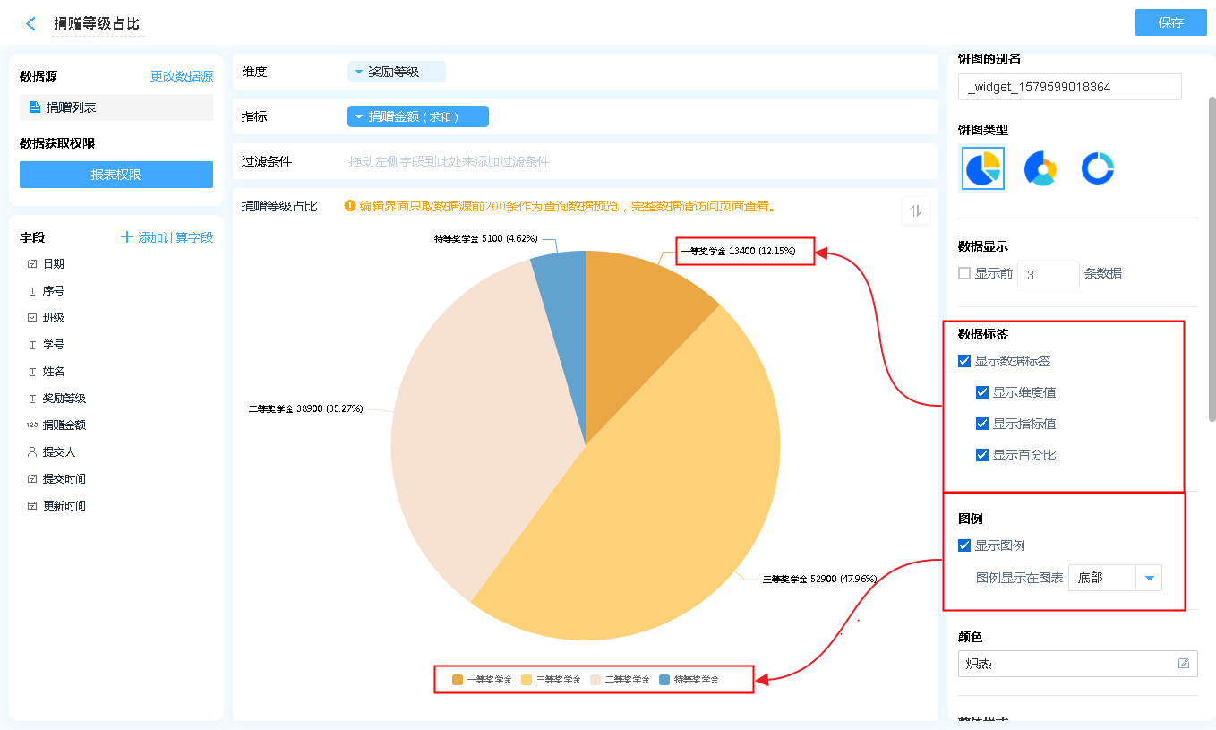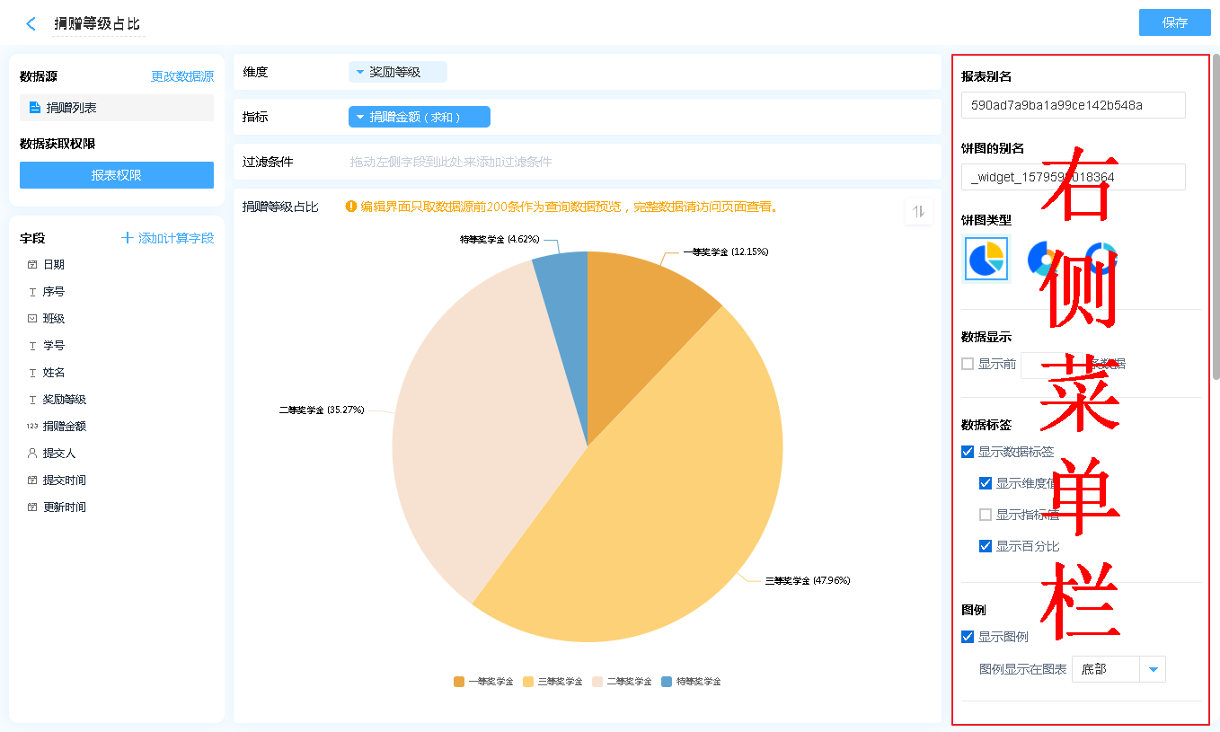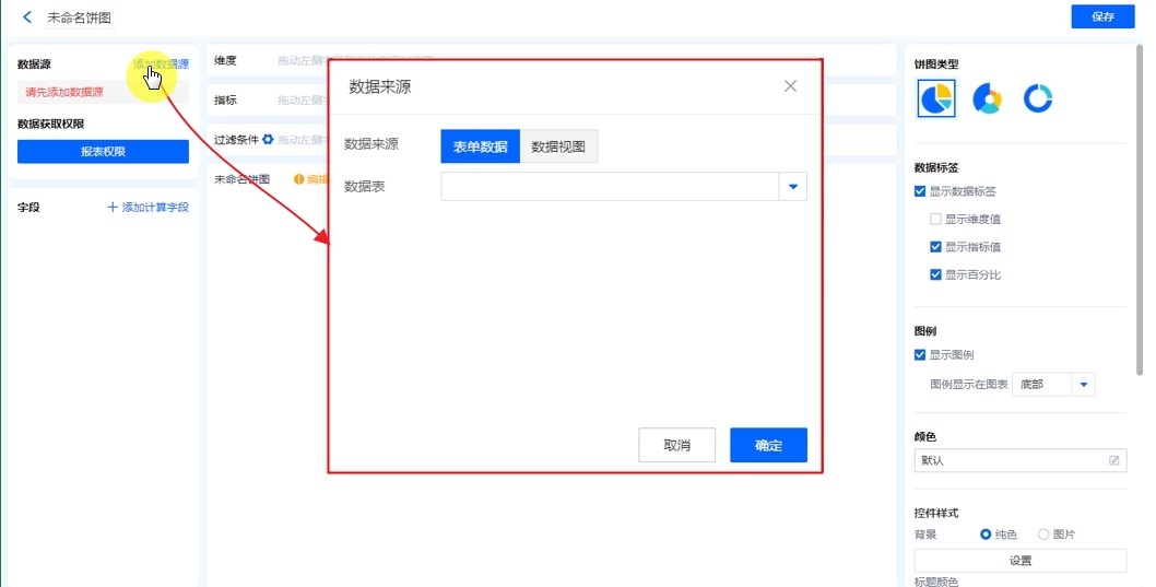 数据源就是指当前饼图的数据来源,可以是表单、数据视图。