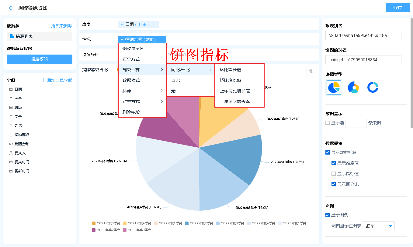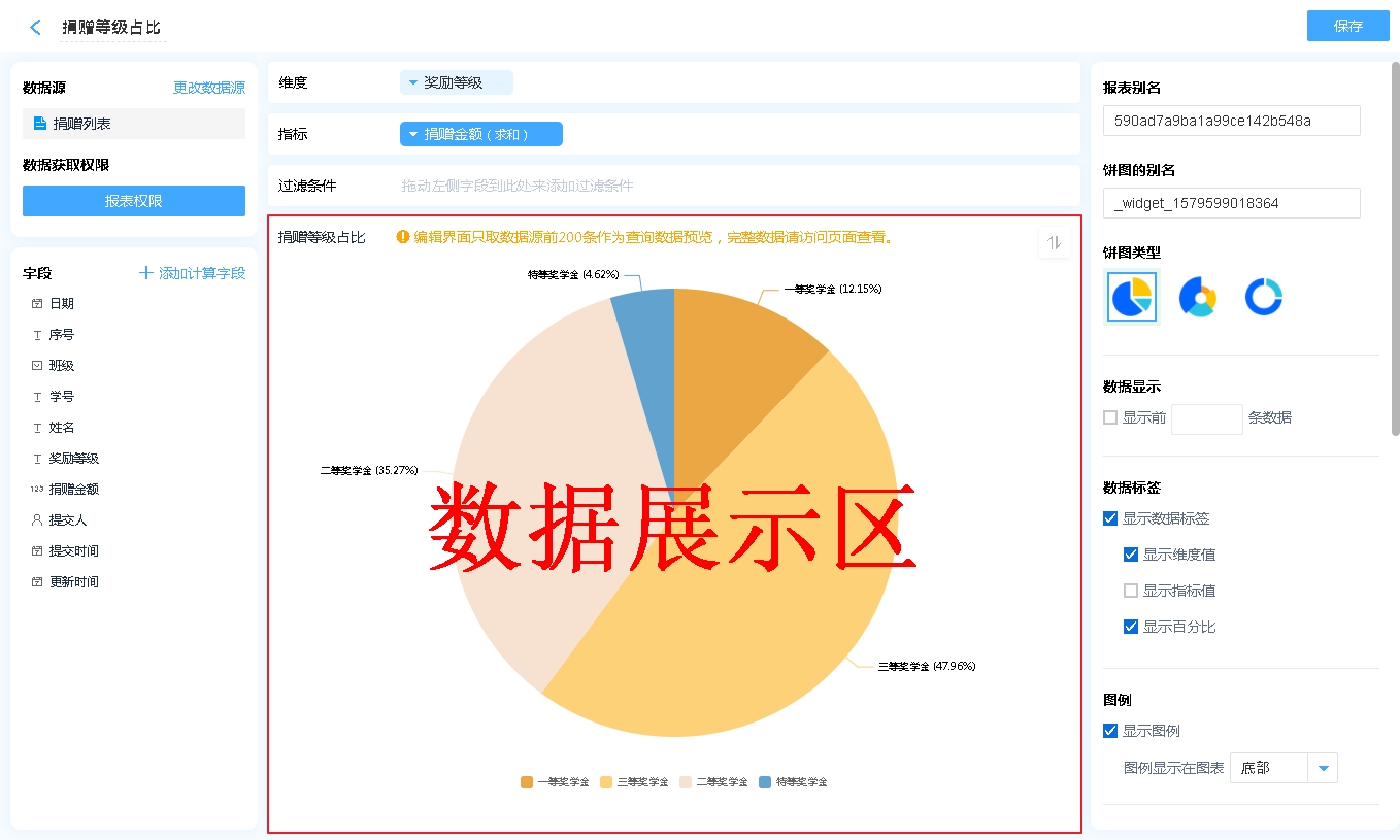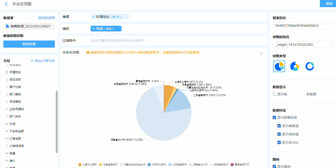• 显示名称: 字段添加进入显示字段区域后,可自行修改其在饼图中的表头文字