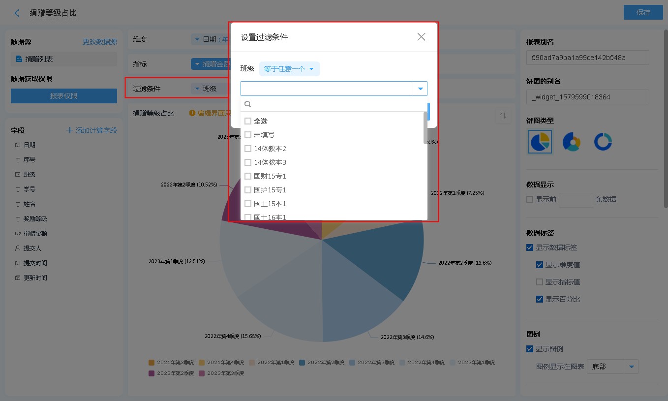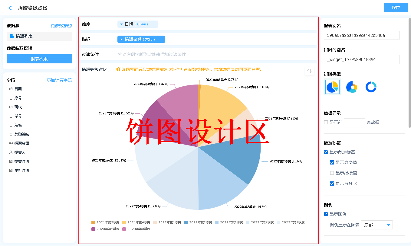 饼图的设计区分为 维度、指标、过滤条件以及数据显示区。