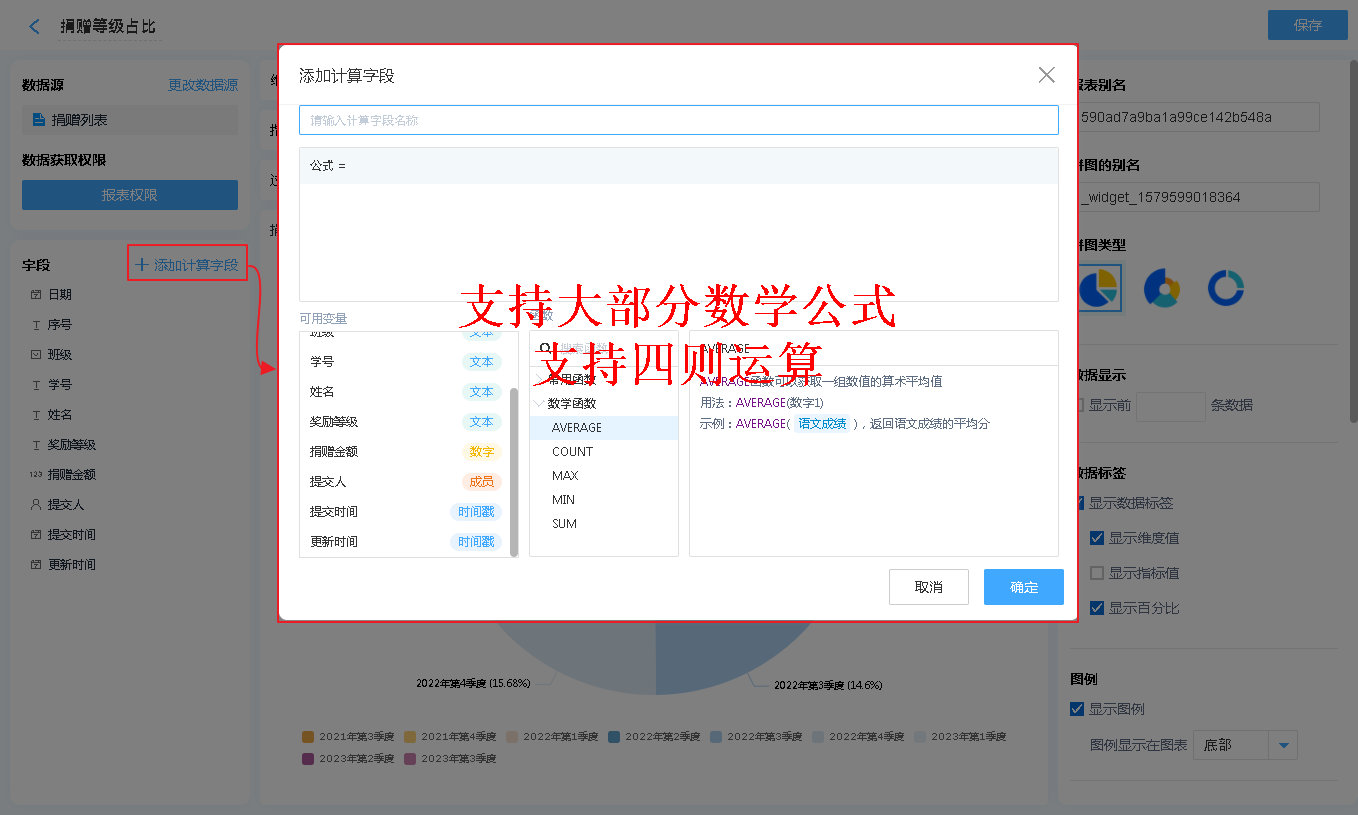 也可以通过增加公式字段,对报表中显示的内容进行简单的计算处理【支持绝大多数数学函数及+-*/四则运算】。