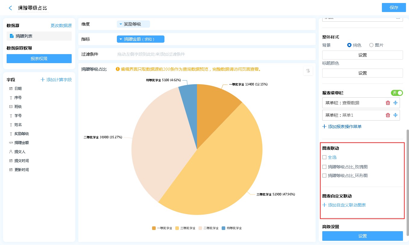 饼图支持和其他表单联动,联动目标支持同数据源的任何报表。主联动表中选择某个字段或某个数据,被联动表中会出现与之相应的数据。