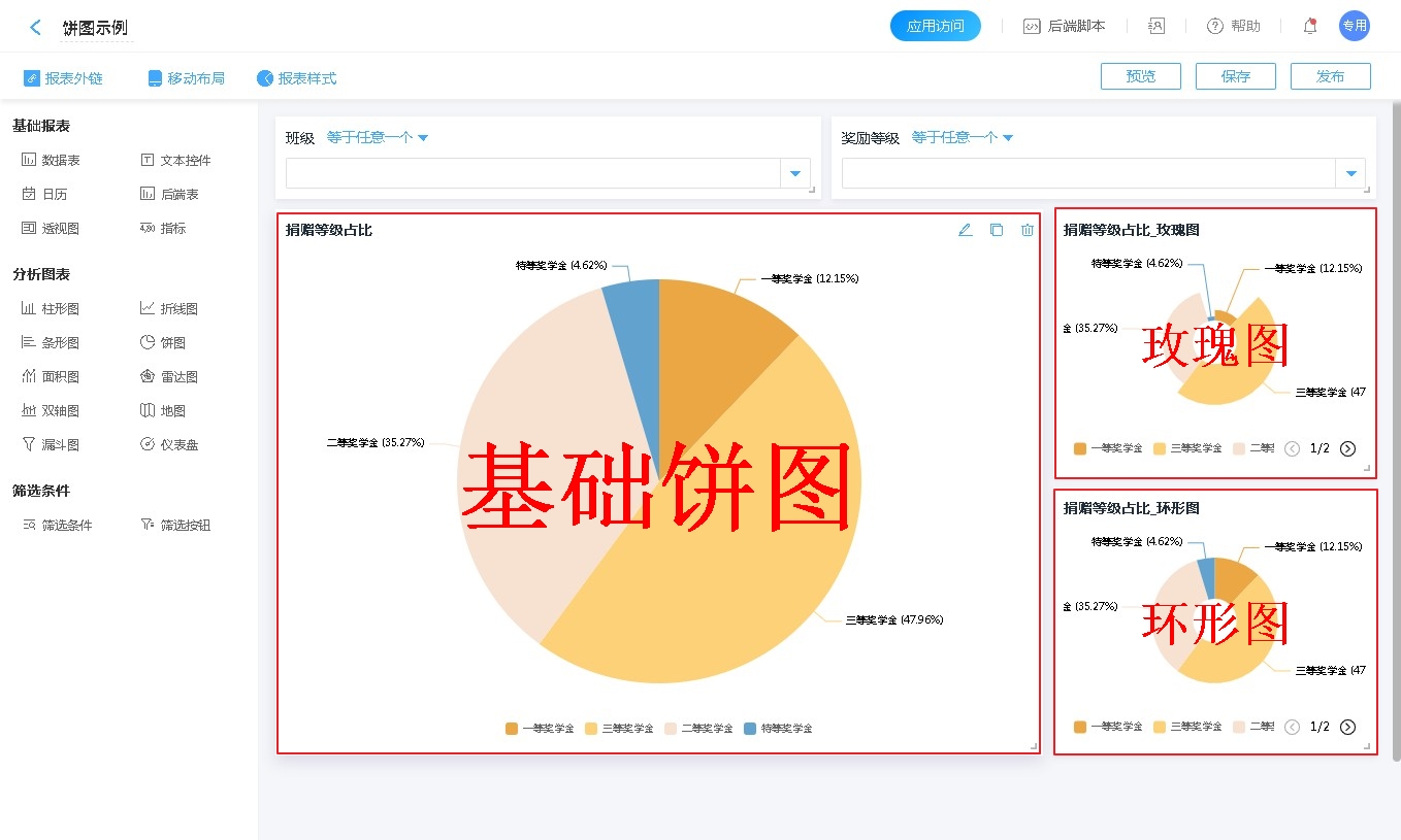 分为基础饼图、玫瑰图、环形图。各个类型的饼图的设置完全一致,只是样式不一致,使用者可根据具体情况选择合适的饼图类型。