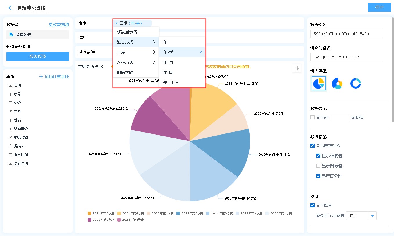 • 汇总方式: 仅日期时间字段可设置,可以设置按照何种日期格式对数据进行汇总(如:按年、按季度、按月汇总)