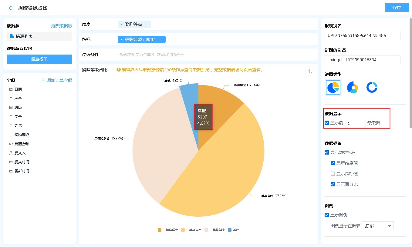 可以设置当前饼图的统计结果中主要显示的内容,如:可以设置仅显示前3条数据的统计信息,其他信息全部归类为'其他'。