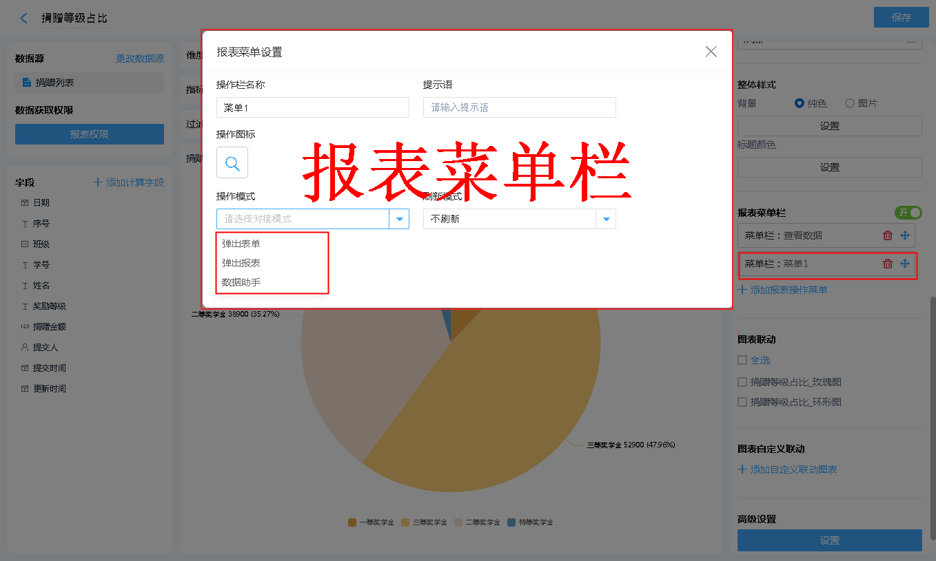 报表菜单 支持 弹出表单、弹出报表、数据助手