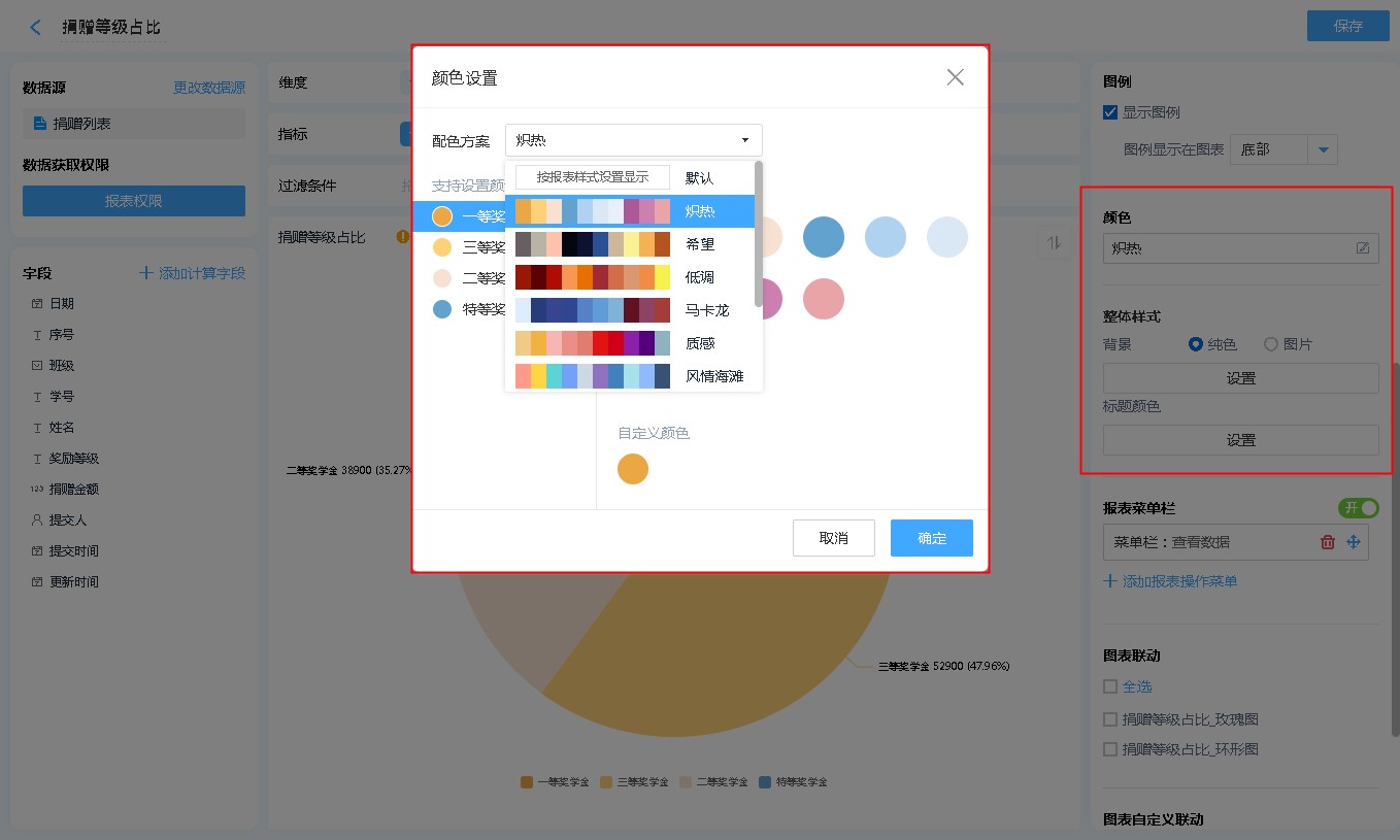 饼图支持样式自定义,可自定义的包括:样式、颜色