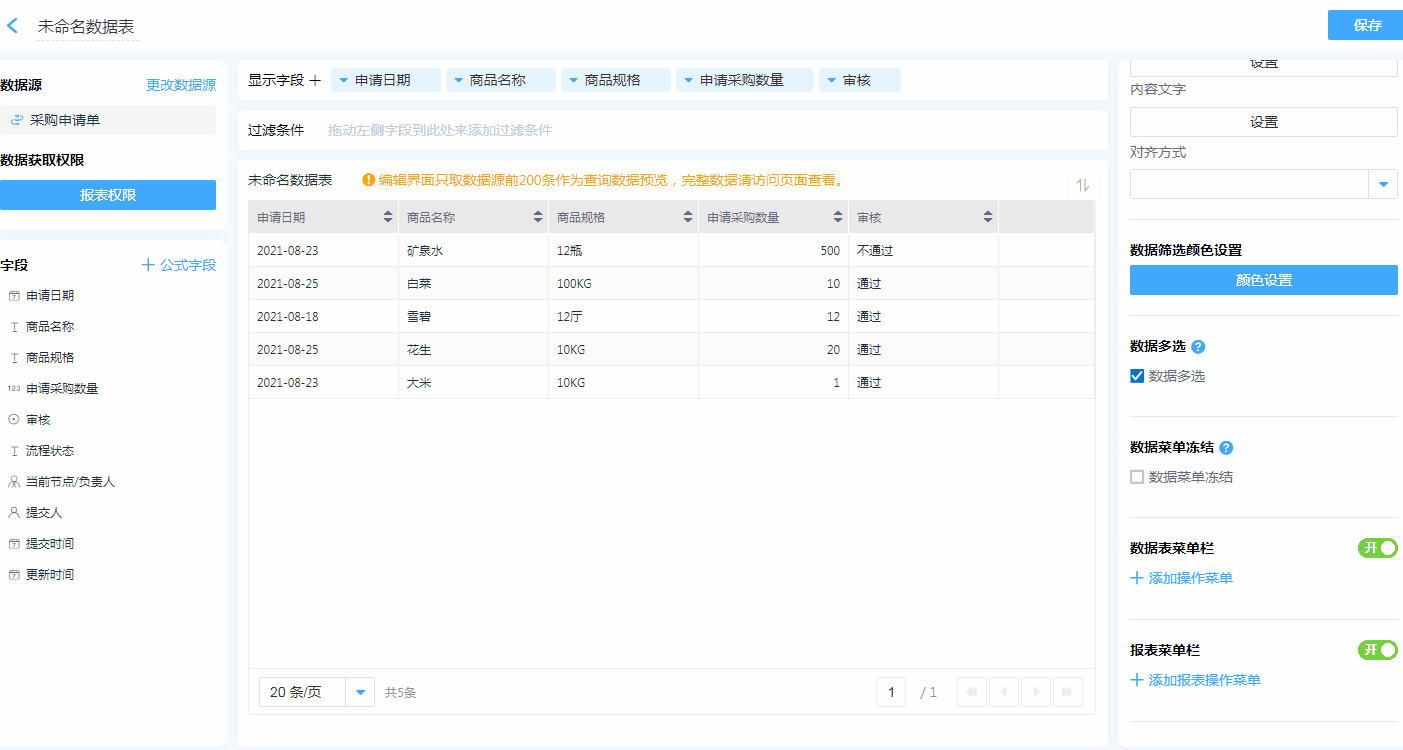 第一步:我们需拖拽一个数据表进行编辑操作,【添加数据源】——【设置显示字段】——【勾选数据多选】