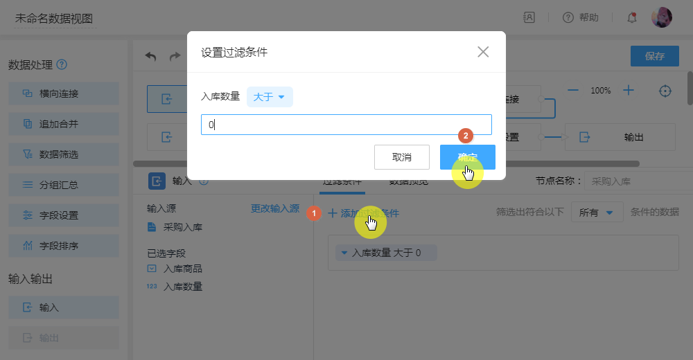 数据源默认配置下,是关联全表数据,可以配置“过滤条件”进行筛选符合条件的数据传入视图使用。