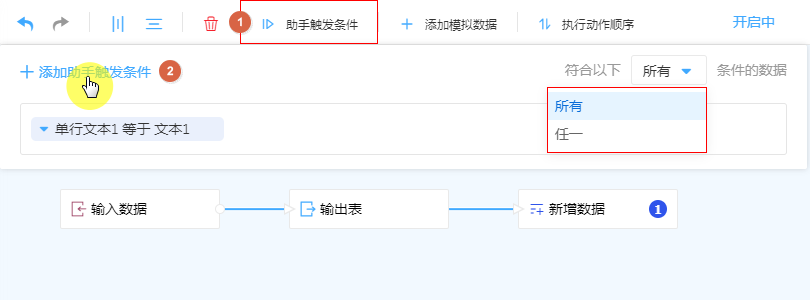 配置触发条件,对“输入数据”做校验判断是否触发执行该助手。